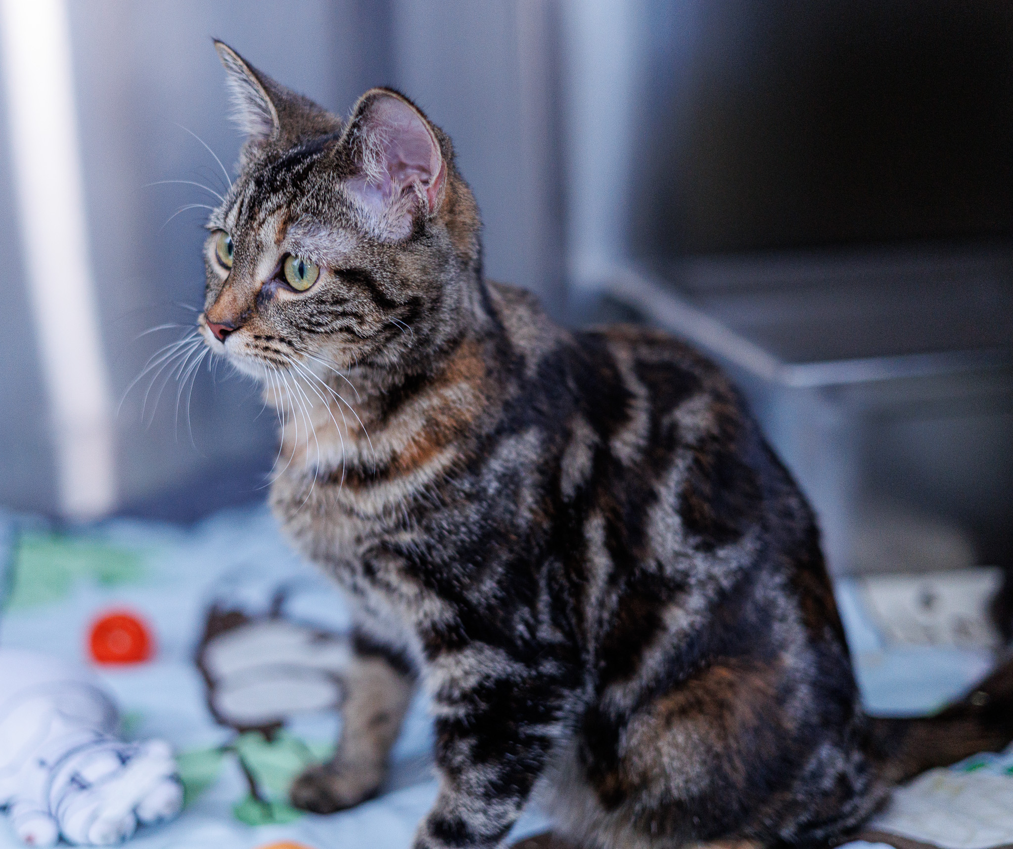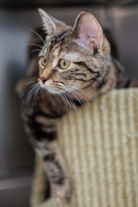 Hi there! I’m Monstera, a 6 month old bundle of energy, mischief, and charm! From the moment I wake up, I’m ready to explore, play, and make you laugh with my antics. One minute I’ll be curled up in your lap purring away, and the next I’ll be zooming across the room like a tiny, furry ninja! I like to keep life interesting! I absolutely love toys, discovering new hiding spots, and soaking up all the love and attention I can get. I’m curious about everything, always investigating the world around me, and when I’m done adventuring, I’ll be right back in your lap for some serious cuddle time!