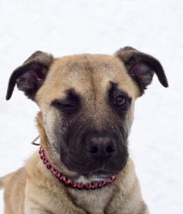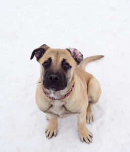 HOWDY HI HEY!! Name’s Vesper, professional goofball and 4 month old Mastiff puppy extraordinaire! Right now, I’m majoring in Being Adorable with a minor in Learning My Manners. I’m still working on all that “basic training” stuff, the classics like sit, stay, and not launching my entire body at you when I get excited (we’re making progress…kind of). I’m a smart girl and I’m picking things up more every day, especially when tasty snacks are part of the lesson. Big brain, even bigger paws. Let’s talk energy, because wow do I have it. I come fully stocked with zoomies, wiggles, and an overwhelming desire to be involved in absolutely everything you’re doing. Making dinner? I supervise. Watching TV? I offer emotional support. Going for a walk? Best day of my entire life. I love to play, explore, and just be part of the action. The great news is I’m a total social butterfly in a giant puppy body. I like people, I like dogs, I like attention, I basically assume everyone is my new best friend. The important thing to know, though, is that I’m still learning I am not actually a tiny lap dog. I’m what experts call “large and enthusiastic.” When it comes to smaller animals, I don’t have a mean bone in my body, I’m just not very aware that my paw is the size of their whole face. I’ll need some guidance and supervision while I figure out how to handle my big ol’ self more gently. I’m hoping for a home that’s ready for puppy shenanigans, continued training, lots of playtime, and a good sense of humor about daily chaos. In return, you get a loyal best friend, an adventure buddy, and a very large shadow who will think you are the greatest human to ever exist!