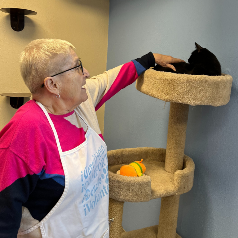 Cat cuddling offers volunteers the opportunity to enrich the lives of the cats and kittens in our shelter. Enrichment activities include brushing, playing, petting, and providing treats, all of which help our cats build confidence, become comfortable with people, and develop the social skills that will support them in their future forever homes.